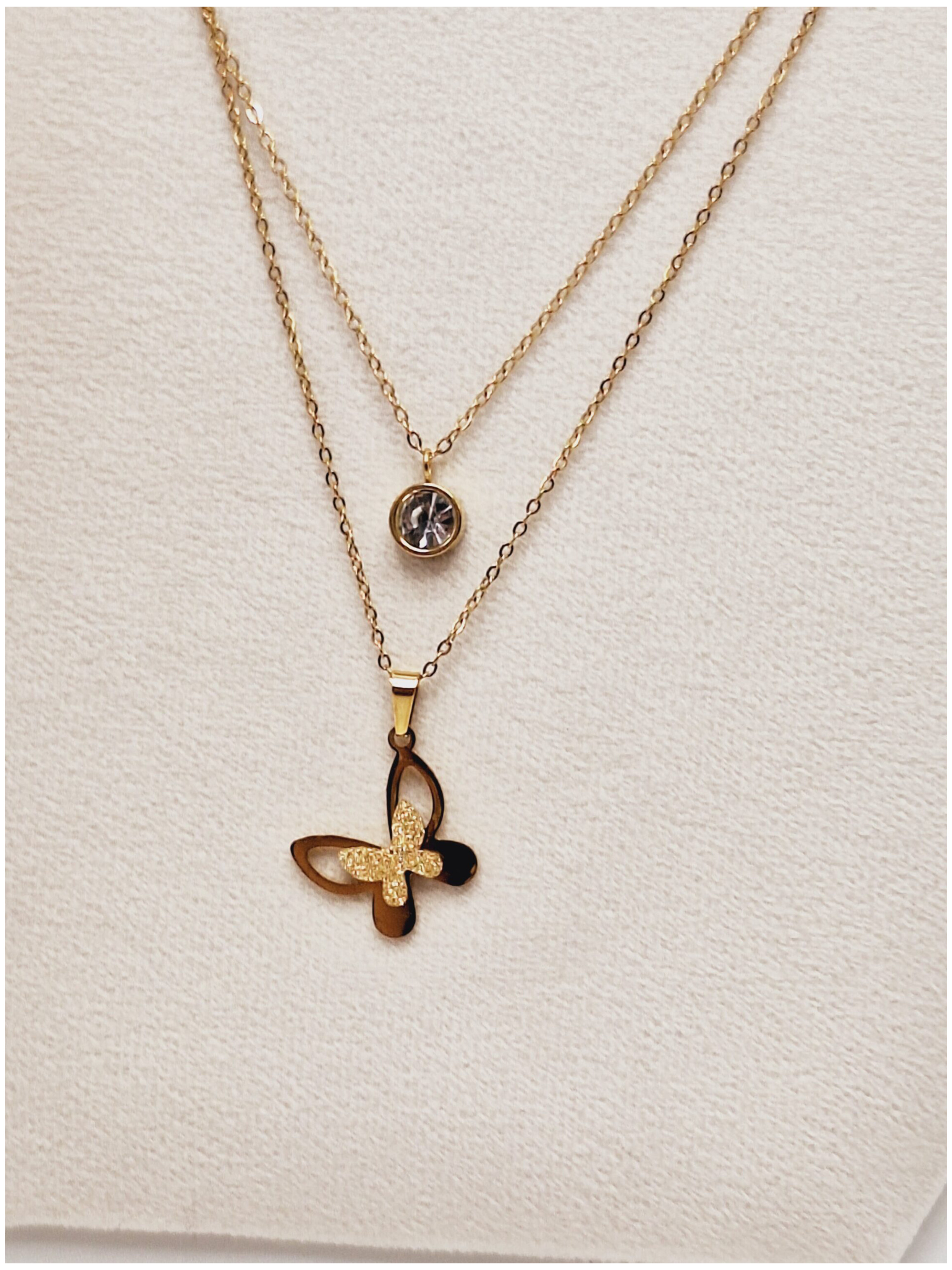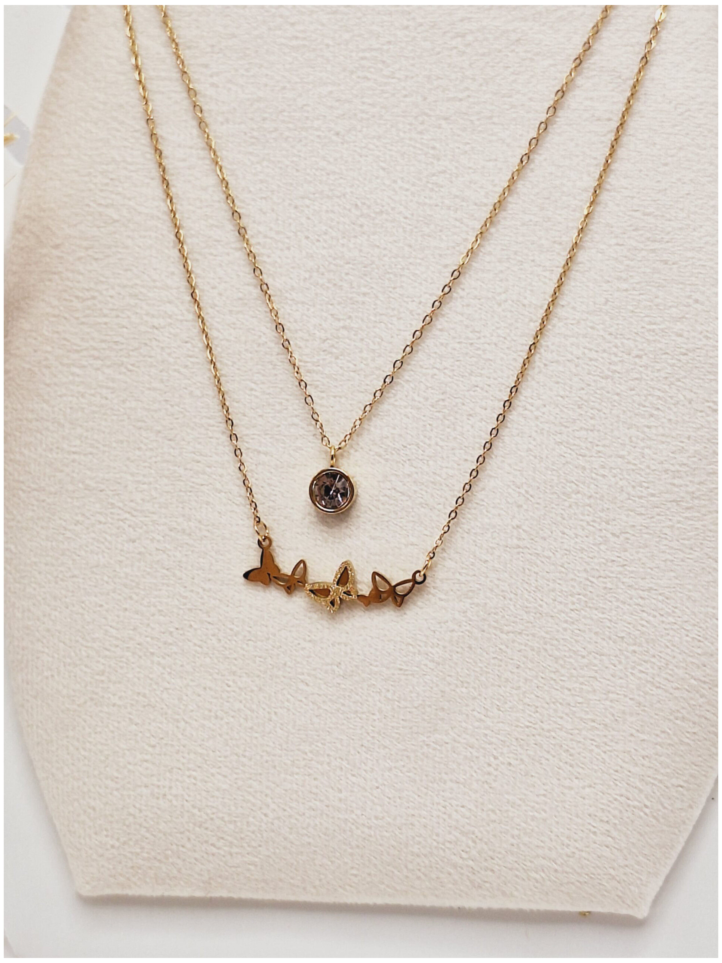 ناموجودست گوشواره و گردنبند دو لاین پروانه های ریز و آویز نگین دار رنگ طلایی استیل