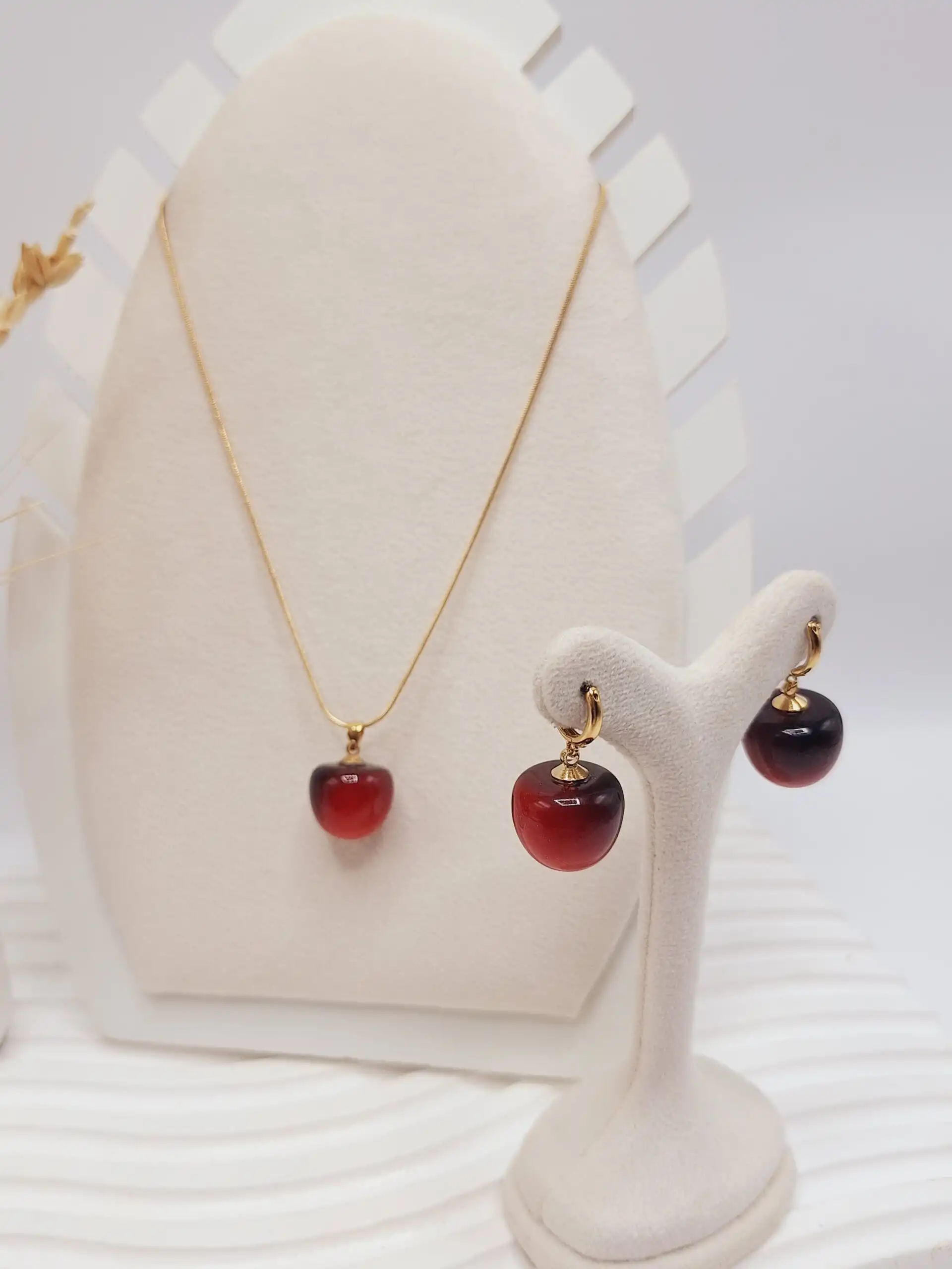 ناموجودست گوشواره و گردنبند دو لاین پروانه و آویز نگین دار رنگ طلایی استیل