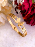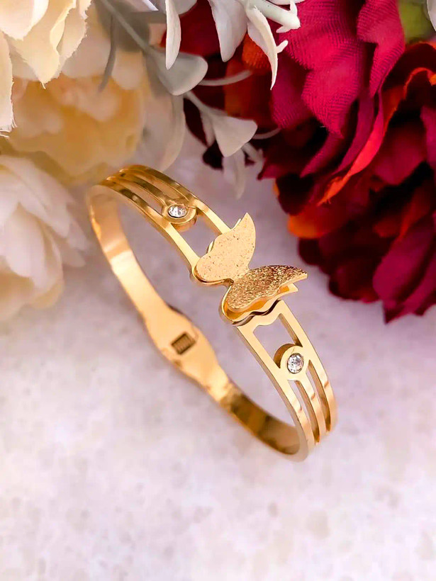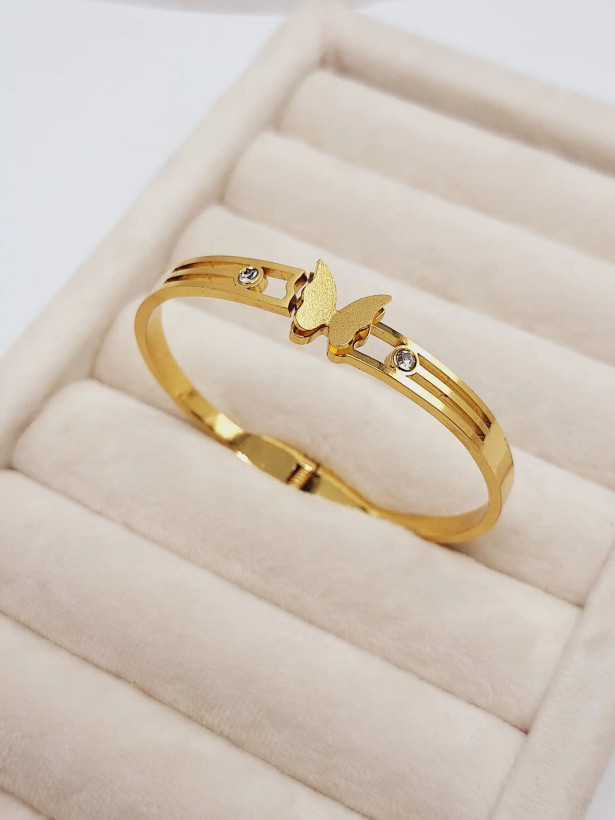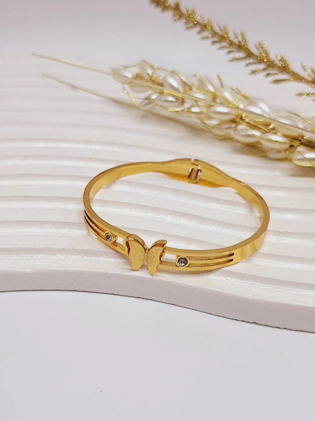 این دستبند طرح پروانه نگین دار طلایی، همچون پرواز نوری از زیبایی و ظرافت بر روی مچ شما میدرخشد 🦋✨