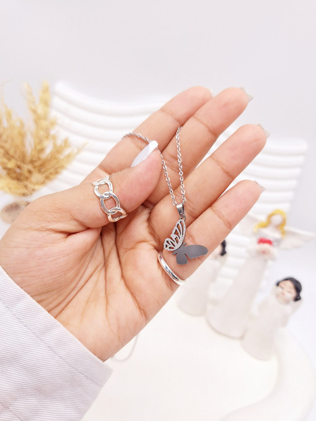 🆔 مدل: ست گوشواره و گردنبند طرح پروانه مخرجکاری نقرهای استیل