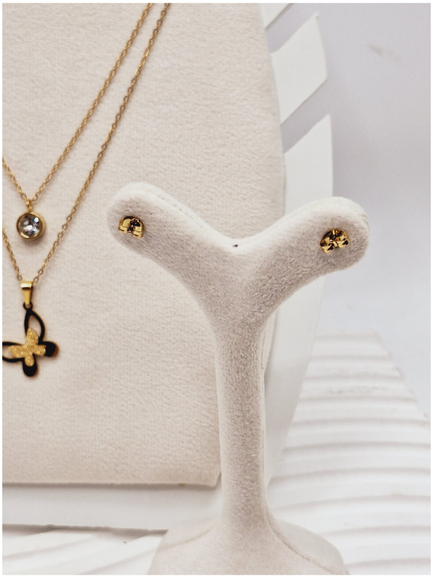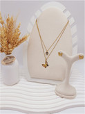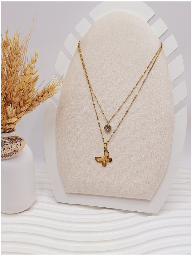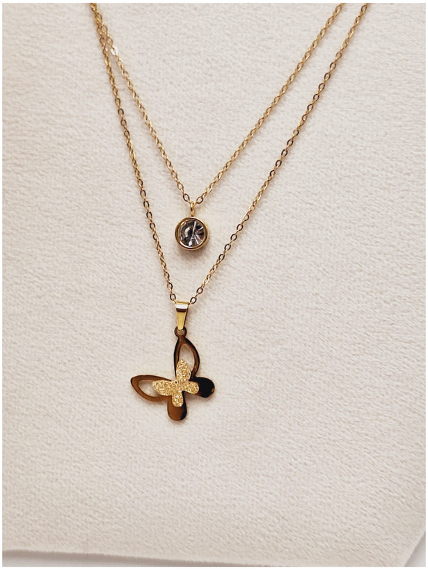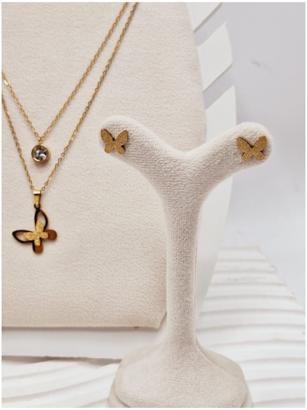 ست گوشواره و گردنبند دو لاین پروانه و آویز نگین دار رنگ طلایی استیل