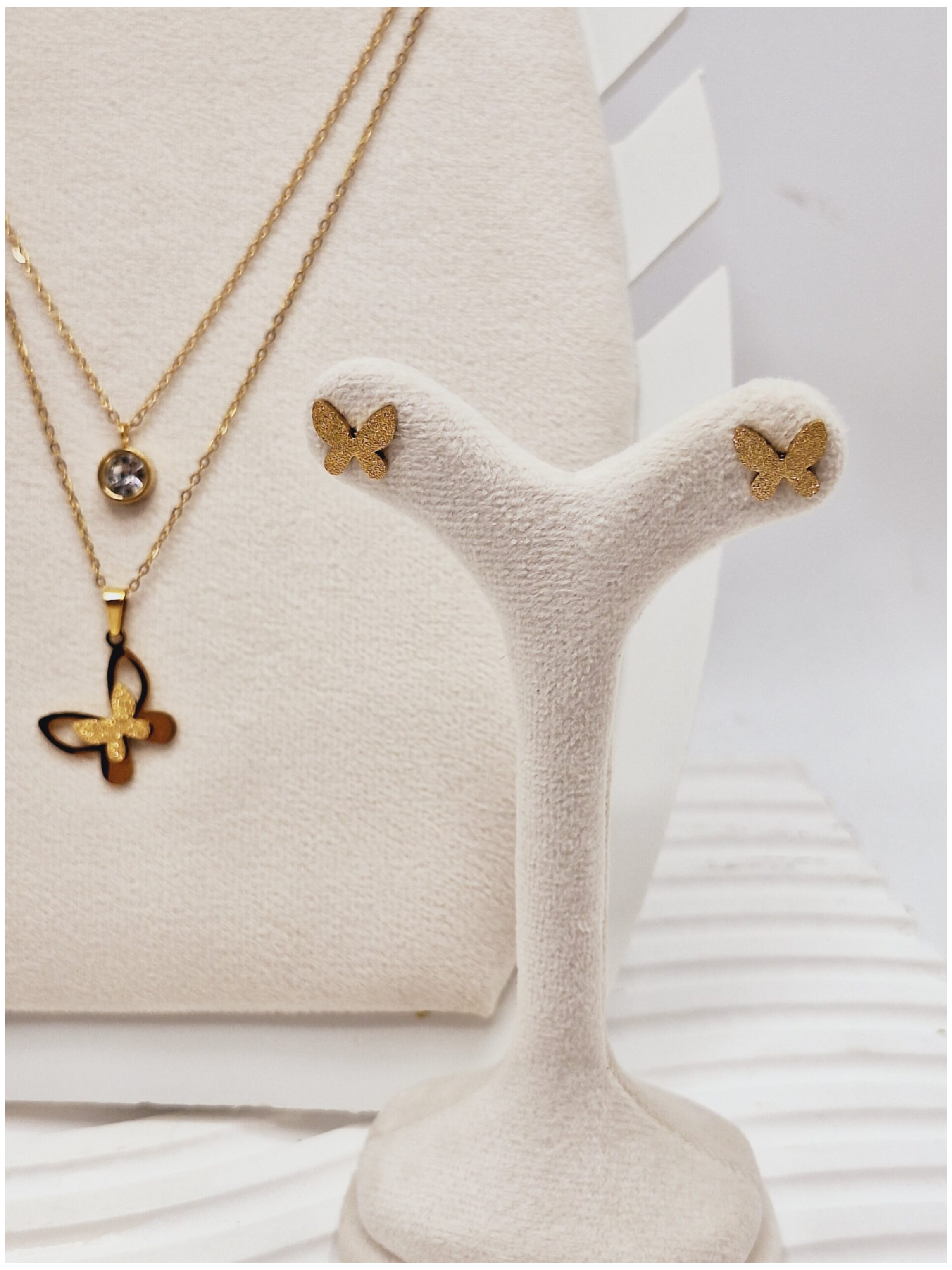 ست گوشواره و گردنبند دو لاین پروانه و آویز نگین دار رنگ طلایی استیل